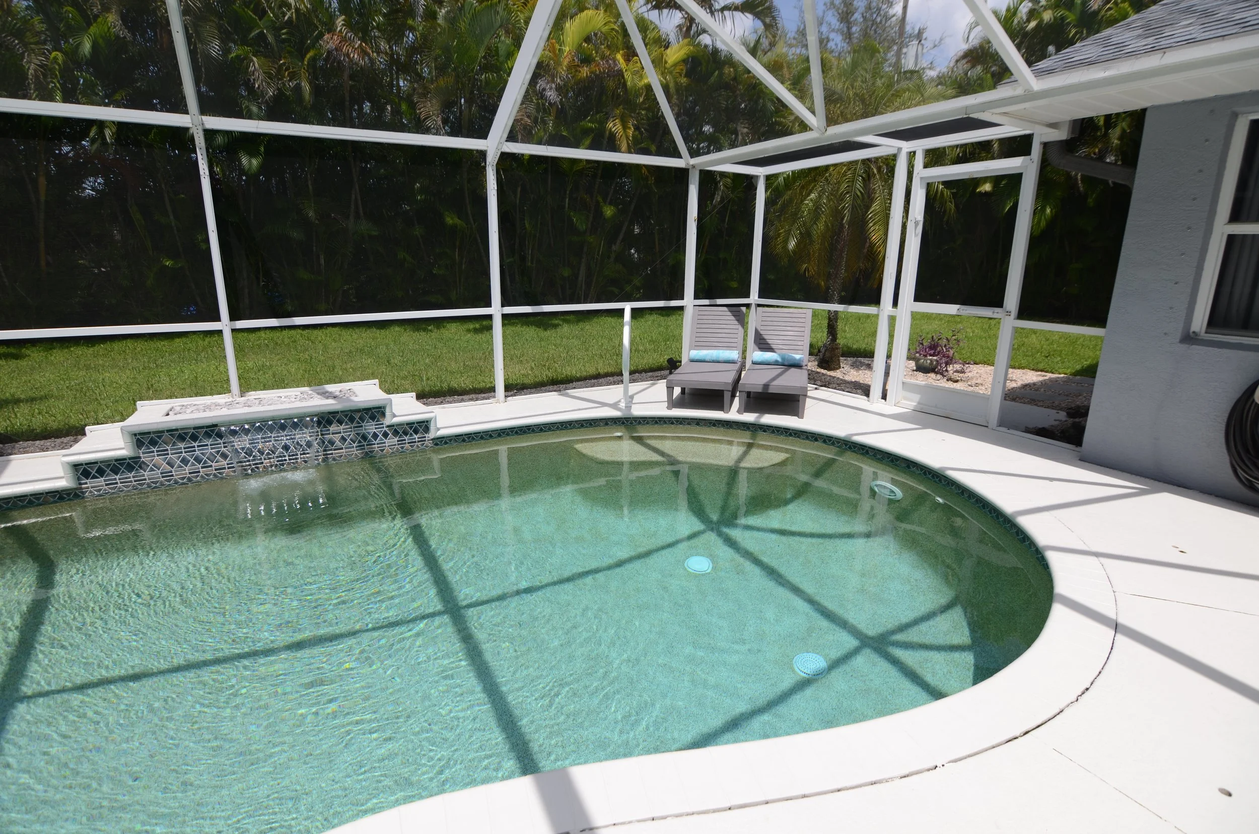The heated, screened in pool with water fountain feature and lanai comes with 2 laydown tanning chairs, lounging chairs, and a grill. What makes this space unique is that it is completely secluded with thick, mature palm trees providing the feel of a private oasis.